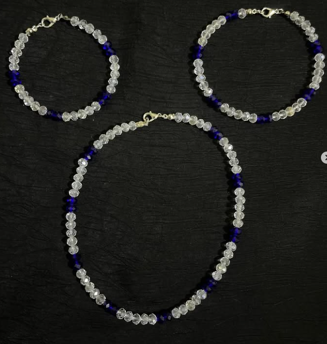 A crisp, refreshing contrast. The clarity of the transparent beads amplifies the deep royal blue accents, creating a look that is as cool as it is sophisticated.