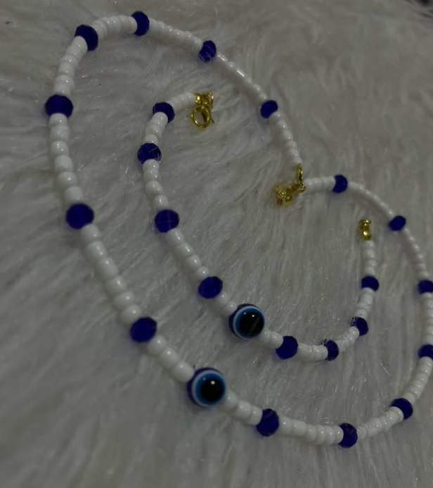 Classic white seed beads accented with electric blue crystals and traditional “Evil Eye” charms. A beautiful talisman designed to bring protection and style to your accessory collection.