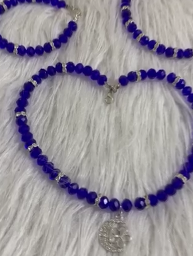 Deep cobalt blue faceted crystals separated by shimmering silver-tone rhinestone rondelles. The necklace features a stunning pavé-set crescent moon pendant, symbolizing mystery and grace.