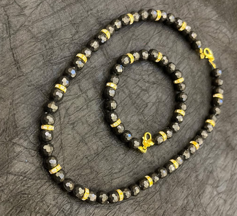 Matte-finish black beads paired with gold crystal-encrusted spacers. Simple yet “dope.”
