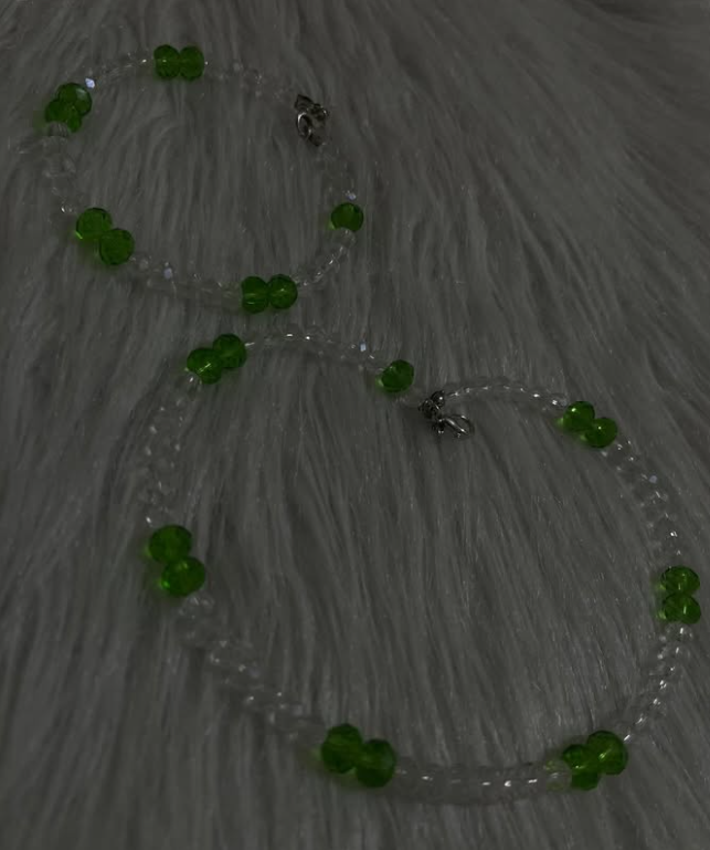 Subtle yet striking. A delicate string of crystal-clear beads interrupted by clusters of vibrant green, offering a fresh, natural vibe with a modern twist.